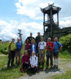 Am 9.6.2012 versammelten sich 11 Optimisten, die Rucksäcke vollgepackt mit Trinkflaschen, Müsliriegeln, Bananen, belegten Broten etc., am Treffpunkt vor der Sparkasse Wunsiedel, um die inzwischen berühmte "12-Gipfel-Tour" im Fichtelgebirge in Angriff zu nehmen. Unser Tourenführer Rainer Rahn erklärte uns die gesamte Tour und informierte uns über die wichtigsten Punkte, u. a. dass der Abschluss der Wanderung das Kösseinehaus sein sollte, wo als Belohnung für diese Tortur eine zünftige Brotzeit und einige malzige Getränke auf uns warten würden. Der Beifall der gesamten Gruppe zeigte, dass dieses Programm allen gefiel. Kurz nach 5 Uhr zwängten wir uns in den Taxibus, der uns zum Kornberg brachte, wo der Start sein sollte. Der Wetterdienst versprach gutes bis ideales Wanderwetter, evtl. begleitet von einigen kurzen Regenschauern, die uns vielleicht streifen könnten. Die Wandergruppe war bunt gemischt; von 17-jährigen Damen, die als absolute Wanderanfängerinnen bis zur Hälfte der Tour mitmachen wollten, bis zu einigen älteren aber gut trainierten Herren jenseits der 60.